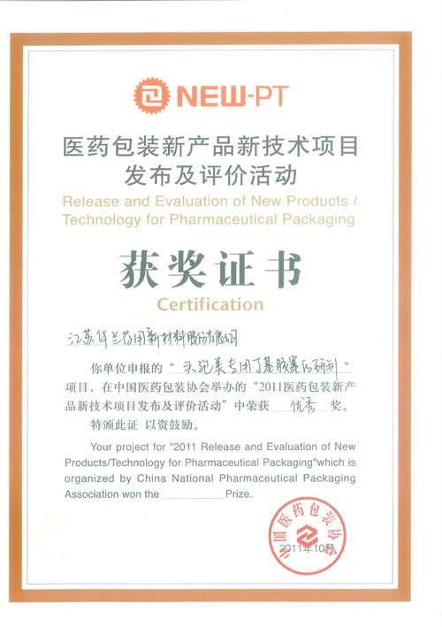 热烈祝贺我公司申报的“头孢类专用丁基胶塞的研制”项目,在中国医药包装协会举办的“2011医药包装新产品新技术项目发布及评价活动”中荣获优秀奖。