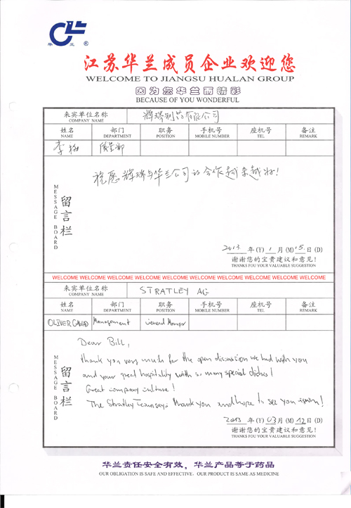2013年3月12日上午,德国LANXESS公司和世界知名咨询公司STRATLEY AG一行6人莅临我司调研交流,并就丁基橡胶在国内医药包装行业的现状及发展趋势进行深入探讨。公司总经理华一敏和技术研究中心主要骨干接待陪同。整个交流过程近三小时,会后STRATLEY AG公司总经理Oliver Gawad 在我司留言簿上写下祝语并与总经理华一敏及公司技术骨干合影留念。