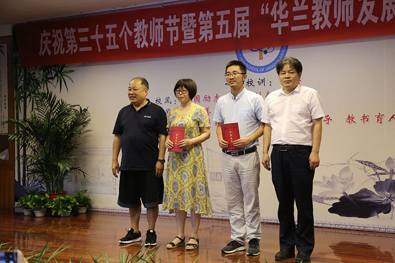 然后,顾建军副书记宣读了 “第五届华兰奖教基金表彰决定”,本次主要颁发了学科质量优秀奖 、优秀班集体奖、项目活动成效奖、教育科研先进奖、30年教龄特别奖、校长特别奖。校长室全体成员分别为获奖团队宣读了颁奖词,并陪同徐立中先生为获奖团队代表颁发了证书和奖金和奖杯。